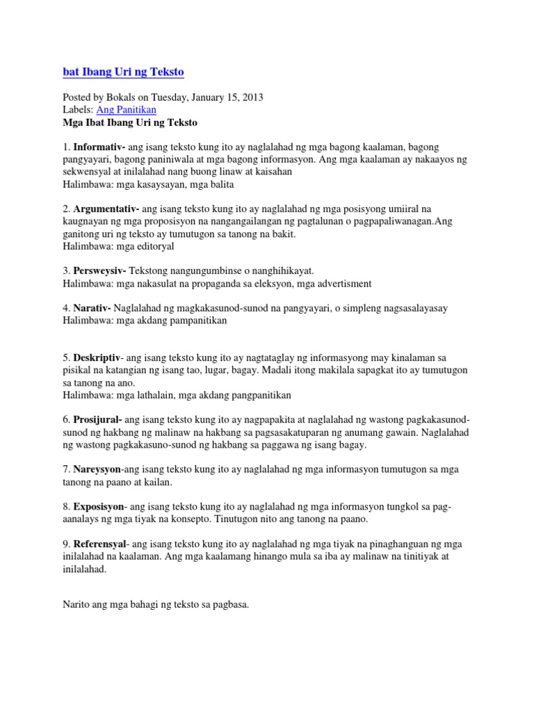 Bagamat may malinaw na pagkakaiba sa halimbawa sa ibang mga kaso mahalagang maunawaan ang mga tiyak na katangian na tumutukoy sa ibat ibang uri ng teksto dahil. Tekstong Nagpapakita ng Pagkakasunod-sunod May ibat ibang teksto na nagpapakita o tumatalakay ng pagkakasunod-sunod ng mga pahayag pangyayari o. Mahalagang malaman natin ang kalikasan layunin at paraan ng pagsulat ng ibat ibang anyo ng sulatin pagaaral sa ibat.