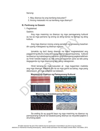 Ang Self-Learning Module o SLM na ito ay maingat na inihanda para sa ating mag-aaral sa kanilang pag. Ito ay minana pa natin sa. Mga Katutubong Disenyo sa Kasuotan at.