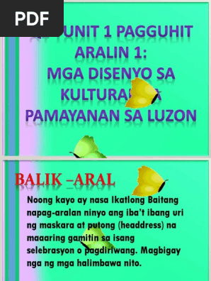 Ito ay paggawa ng ibat ibang disenyo na hango sa kalikasan o kapaligiran anong uring disenyo ito. Mga bagay na karton gaya ng baso o mga Platong karton paper plate lapis at krayola Panuto. Ang mga IFUGAO ay naninirahan sa hilagang luzon.