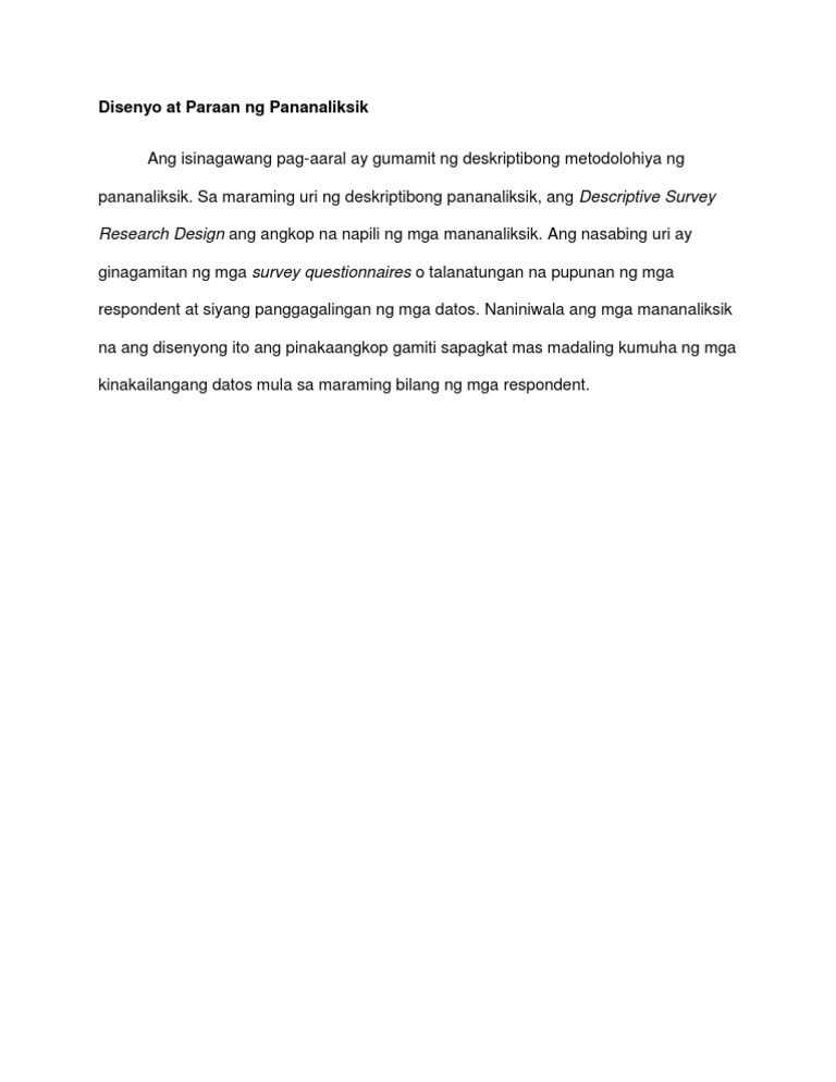 View FILIPINO-THESIS-2docx from PSYCH FIL-4 at Our Lady of Fatima University Quezon City. Disenyo at Paraan ng Pananaliksik Disenyo ng Pananaliksik 19 Mga Respondente Subjek 19 Paglalarawan ng Instrumentong Kagamitan 21 Paglilikom ng Datos 21 Estatikong Pagtrato 21 4. Nagbibigay ito ng sapat na impormasyon o kaalaman tungkol sa paggamit ng wikang.