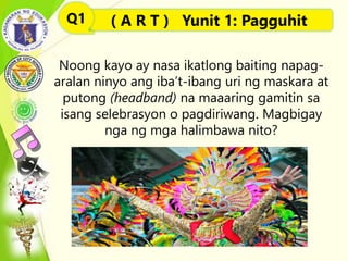Iba't ibang uri ng maskara at putong. New questions in Art. Ngayon ay nais kong kilalanin ninyo ang mga larawang aking inihanda at kung saang selebrasyon ito. Noong kayo ay nasa ikatlong baitang napag-aralan ninyo ang ibat ibang uri ng maskara at putong at kung saan ito matatapuan sa pilipinas.