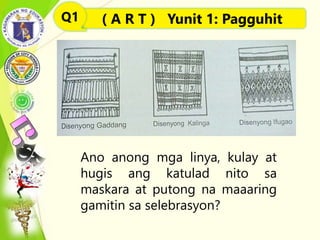 Saan hango ang disenyong etnikong motif. May mga linyang makapal na malapad at mabigat tingnan. 3Iguhit ang napiling disenyo sa karton o gamit ang lapisMaar ring gumamit o umisip ng sariling disenyo gamit ang mga h kulay linya at ang prinsipyong paulit-ulit.