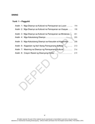 Isinasaad ng Seksyong 176 ng Batas ng Pambansa Bilang 8293. Tingnang mabuti ang larawan. Ang modyul na ito ay nagtatalakay ng likha ng sining at nalalaman ang kahalagahan ng isang disenyo mula sa mga katutubong pamayanan sa pamamagitan ng kasuotan at palamuti.