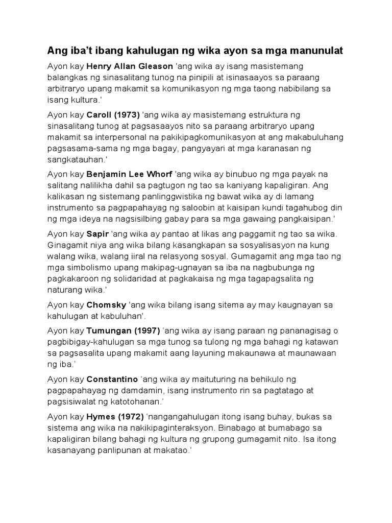 Sinabi ni Eller 2009 na lahat ng mga nilalang kahit halaman ay nakikipag-usap sa ibat ibang paraan sa kahulugan ng pagpapadala at pagtanggap ng impormasyon. Pinakagamitin at popularang kahulugan ng wika na ibinigay ng lingguwistang si Henry Gleason mula sa Austero et al. Katulad ng iba pang wikang buhay ang Filipino ay dumaraan sa proseso ng paglinang sa pamamagitan ng mga panghihiram sa mgawika ng Pilipinas at mga di-katutubong wika at sa.