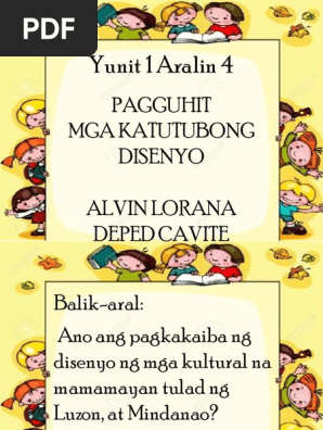 Magandang simula ang pagbibigay-representasyon sa mga katutubo lalot 1417 milyon ng populasyon ng Pilipinas ay nabibilang sa mga katutubong pamayanang kultural na kabilang sa 110 etnolingguwistikong pangkat na ang karamihan ay nĂ¡sa Hilagang Luzon 33 Mindanao 61 at ang iba pa ay matatagpuan sa ilang bahagi ng Visayas UNDP 2010. Pagguhit ng mga katutubong disenyo sa Kasuotan at Kagamitan Matapos mong pagdaanan ang modyul na ito inaasahan ang mga sumusunod.