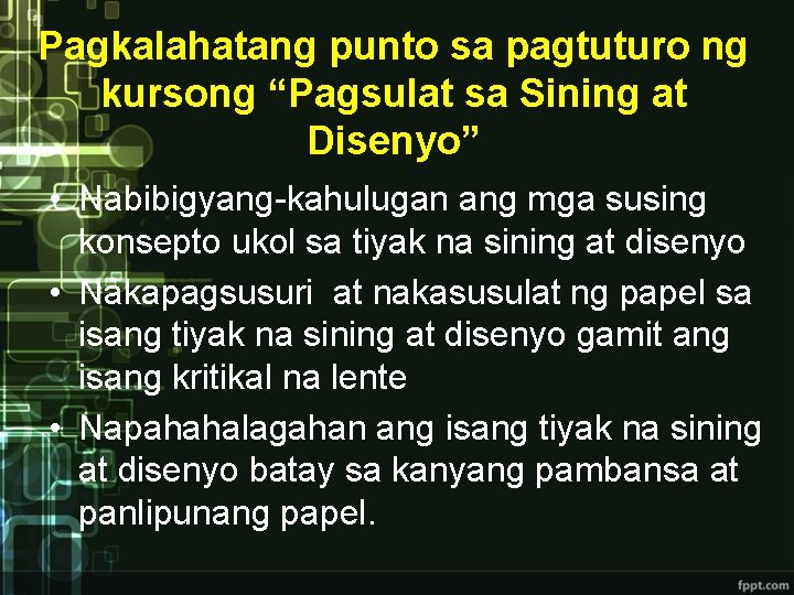 Pagkalahatang punto sa pagtuturo ng kursong Pagsulat sa Sining at Disenyo Nabibigyang-kahulugan ang mga susing konsepto ukol sa tiyak na sining at disenyo Nakapagsusuri at. Tayo ay ginawang katiwala ng Diyos sa maraming bagay - isa na rito ang oras.