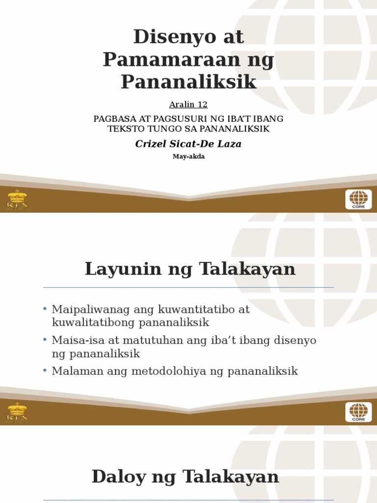 Pages 17 This preview shows page 6 - 9 out of 17 pages. Ang mga pananaliksik na nasa gantong disenyo ay naglalayong malalimang unawain ang isang particular na kaso kaysa magbigay ng pangkalahatang kongklusyon sa ibat ibang. PAMAMARAAN NG PANANALIKSIK Disenyo sa pananaliksik O Ito ay ang pangkahalatang estratehiya na pinipili ng mananaliksik upang pagsama-samahin ang lahat ng bahagi at proseso ng pananaliksik sa maayos at lohikal na paraan.