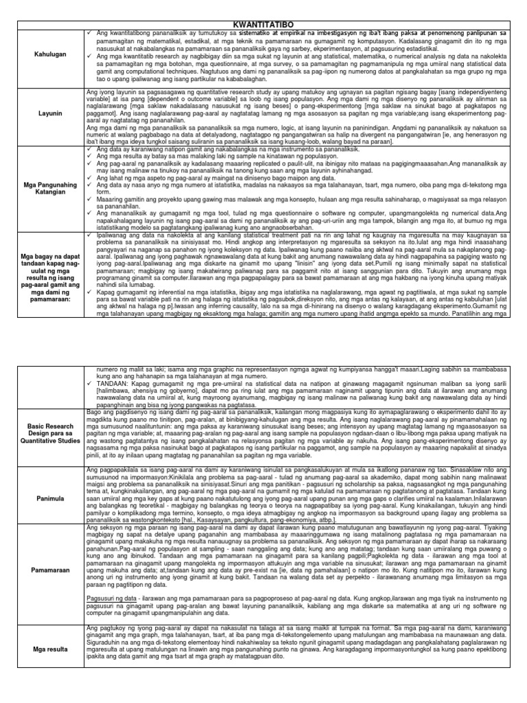 Kuwantitatibo na disenyo. Click card to see definition. Tumutukoy sa sistematiko at empirikal na imbestigasyon ng ibat ibang paksaNapakaloob ang ibat ibang estadistikal na pamamaraan para sa kompyutasyon at pagsusuri ng datos. - naglalaman ng paraan ng pangongolekta presentasyon at pagsusuri ng datos.